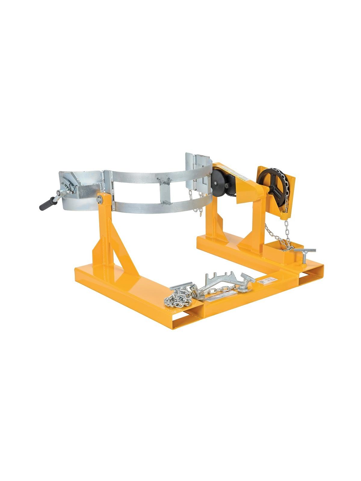 Safety restraint securely attaches to forklift. Drums must be full to rotate at rated capacity. Fork pockets measure 7"W x 2-5/8"H I.D. on 31-3/8" centers. Rotates manually - a 15' chain runs back to driver. FOB Shipping Point.