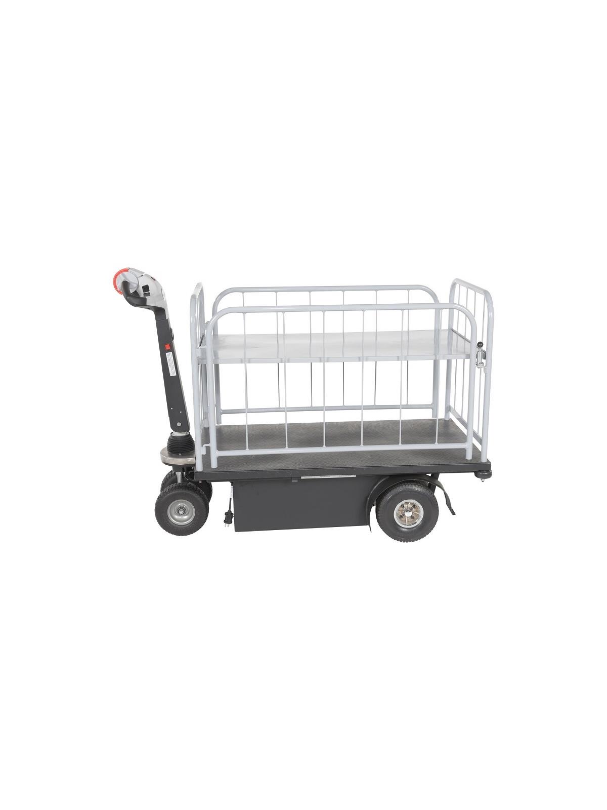 Unique carts feature built-in traction-drive system for easy transportability. Ideal for applications including mail rooms, hospitals, supermarkets, hotels and warehouses. Features 450W electric drive motor with two 12V batteries for power. 110V AC internal battery charger is included along with battery level indicator. Variable throttle speed control for precise maneuvering and positioning is located in the handle. Units roll smoothly on (2) 9" x 3-1/4" solid foam rubber steering wheels and (2) 10" x 3-1/4" solid foam drive wheels. Walking speed is 0-2.8 mph when unloaded and 0-1.5 mph when loaded. Speed control is conveniently located in handle. Handle pivots back towards operator and includes horn and emergency stop. Maximum incline is 7 degrees. Each shelf includes a tread plate surface. Deck height 14". FOB Shipping Point.