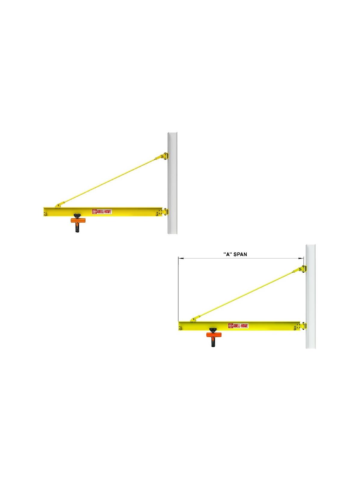 Top-Braced Wall Mounted Jib Crane with 200 Degree Rotation for maximum hook coverage. This all purpose tie rod wall mount jib crane is designed for heavy duty applications and produced from high-grade steel components. Hinge mounts easily to any substantial structural steel building column at desired height. Tie rod is threaded for ease of installation and field adjustments. Crane fittings have bearings with lube fittings for long lasting life and ease of movement. Structural steel is finish painted in highly visible Safety Yellow enamel. Made in the USA. Standard Jibs available up to 5 ton capacity and 20 ft. spans. Call for any span or capacity. FOB Shipping Point.