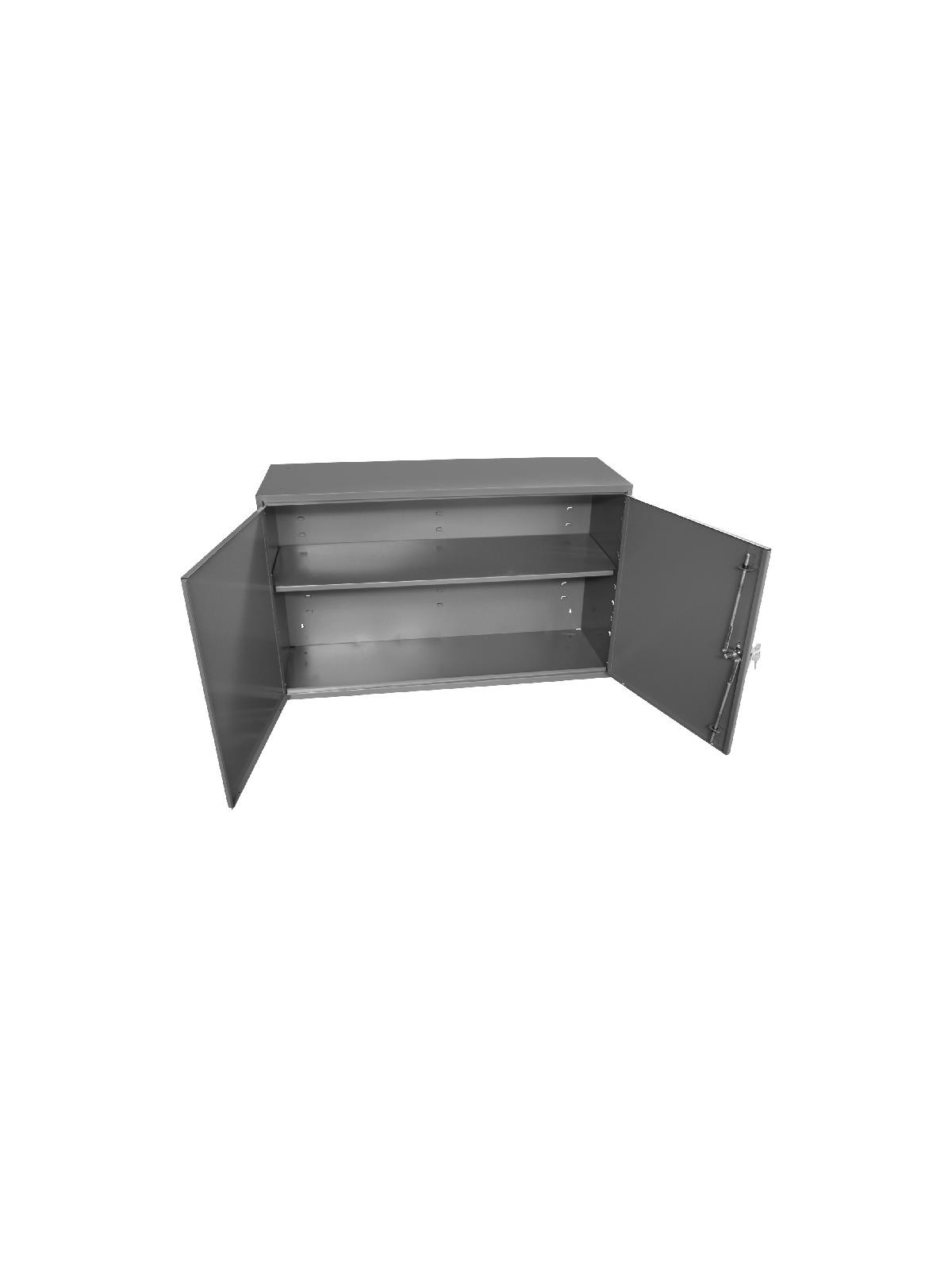 All-welded steel construction prevents warping and twisting. Full piano hinges prevent doors from sagging. Key hole slots in back of unit for wall mounting. Durable, gray, powder coat finish. FOB Shipping Point.