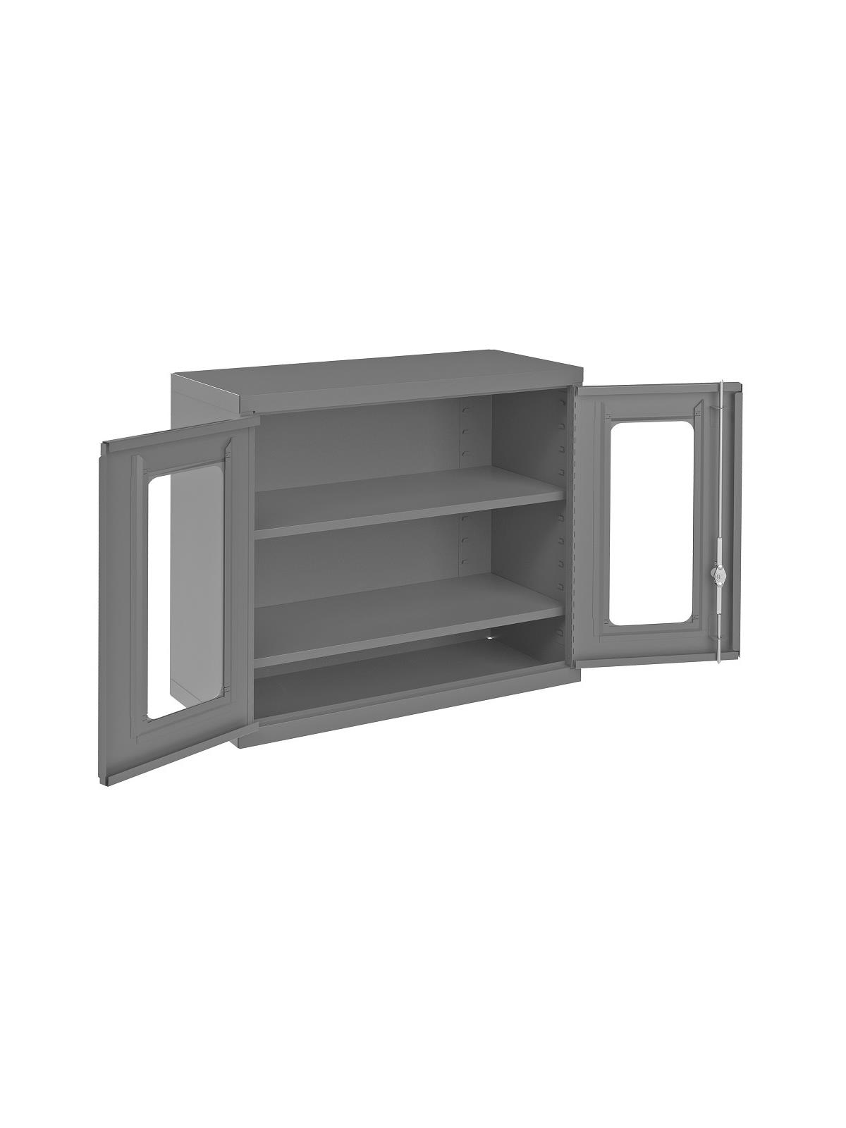 18 gauge, all welded, steel construction. Includes mounting hardware. Includes 2 adjustable shelves that adjust on 2" centers. Locking system with keys included. Keyhole slots in the back of the unit for wall mounting. Ships fully assembled. Gray, gloss powder coat finish. FOB Shipping Point.