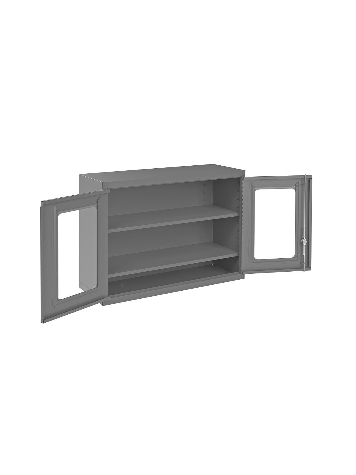18 gauge, all welded, steel construction. Includes mounting hardware. Includes 2 adjustable shelves that adjust on 2" centers. Locking system with keys included. Keyhole slots in the back of the unit for wall mounting. Ships fully assembled. Gray, gloss powder coat finish. FOB Shipping Point.