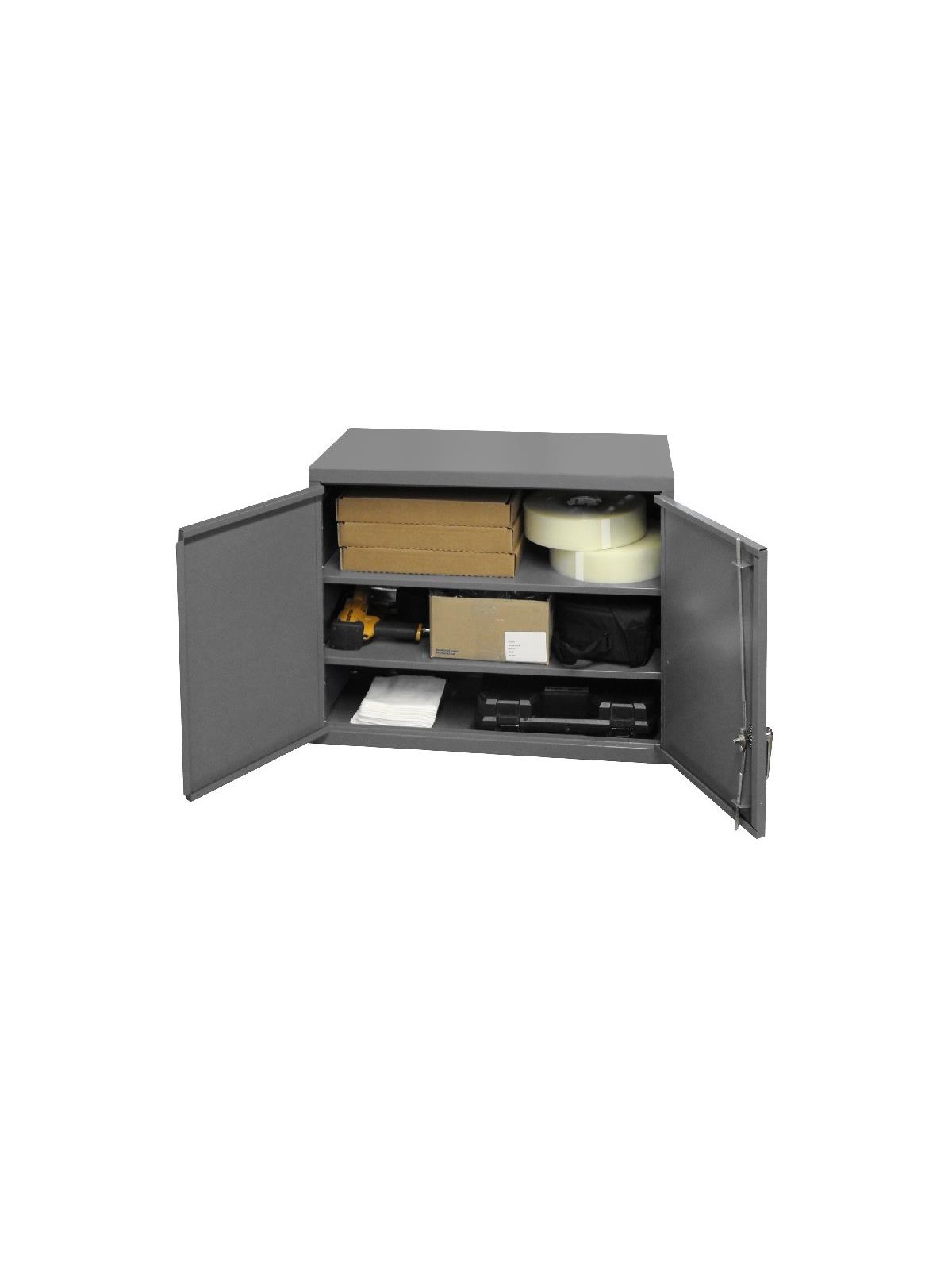 18 gauge, all welded, steel construction. Includes mounting hardware. Includes 2 adjustable shelves that adjust on 2" centers. Locking system with keys included. Keyhole slots in the back of the unit for wall mounting. Ships fully assembled. Gray, gloss powder coat finish. FOB Shipping Point.