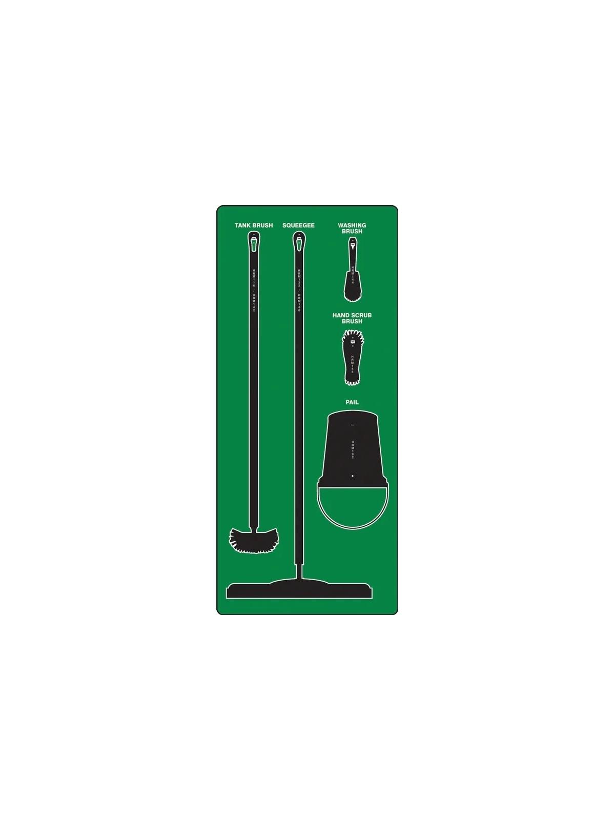 Designed for wet environments, color code your cleaning tools for distinct purposes. Keep general maintenance and cleaning tools organized, neat and always ready for use. Minimize downtime searching for tools by keeping them in one centralized location. Available in a variety of materials to match your environment: Ultra Aluma-Lite™, and Accu-Shield™. 4 color options available with your choice of either black or white tool shadows. Ideal for non-food contact & general maintenance. Promotes tool accessibility at point of use benefits. Maximizes efficiency, organization and accessibility. Minimizes wasted travel time to supply rooms/closets. Provides easy and fast janitorial solutions without added physical stress. Shadow Board Dimensions: 68"H x 30"W. Features 1/2" rounded corners and 3/8" mounting holes. Boards include mounting hardware for tools. Some assembly required: instruction and assembly hardware included. Due to size and/or weight, this product may need to ship LTL. FOB Shipping Point.