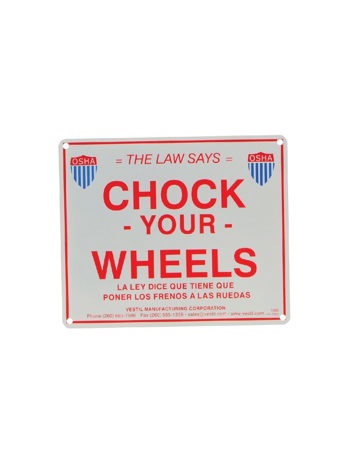 Wheel Chock Warning Signs - Warn truck drivers and dock workers to chock their wheels as required by law. Weather resistant. Bright red lettering provides high visibility. Sign has four (4) mounting holes. Measures 11-3/4"W x 9-3/4"H. Specialty signs available. FOB Shipping Point.