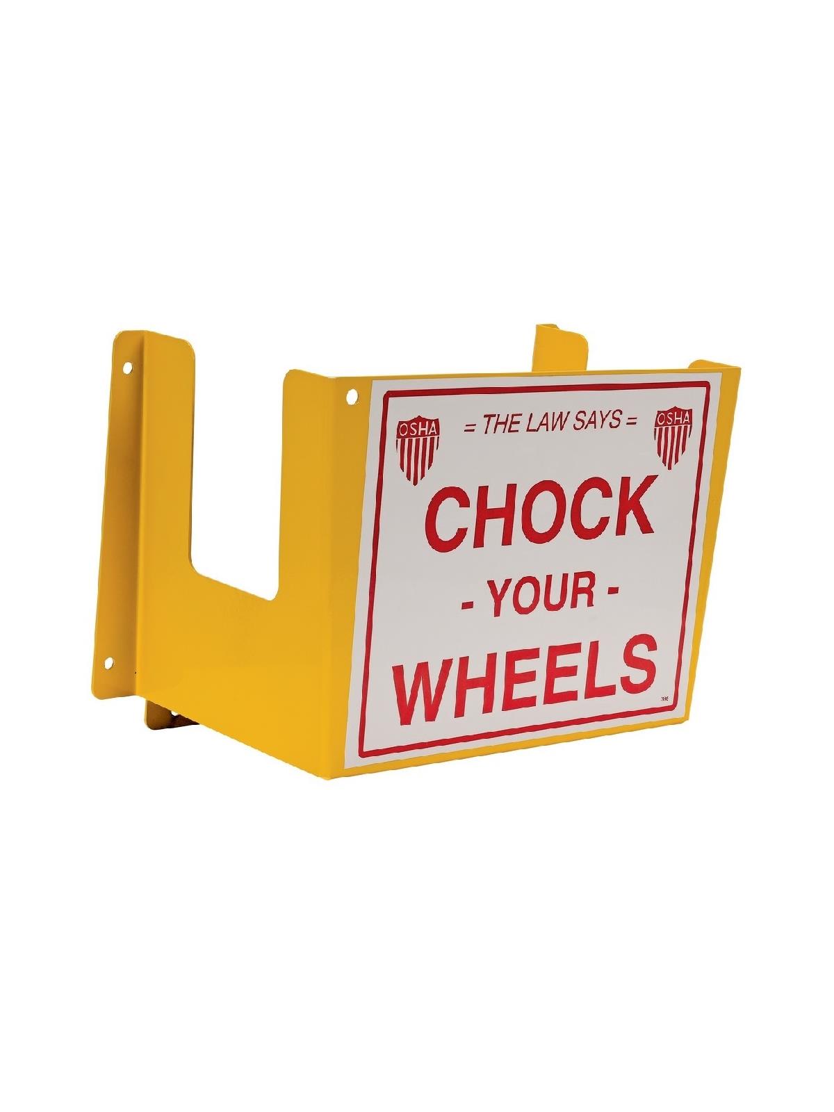 Wheel Chock Holders - Keep wheel chocks safe and prepared for use at any moment. The holder features steel construction for long life and durability, baked-in powder-coated toughness for visibility and pre-drilled mounting holes for easy attachment. Includes a vinyl sticker attached to front of holder which reads "The Law says CHOCK YOUR WHEELS". Capacity 40 lbs.